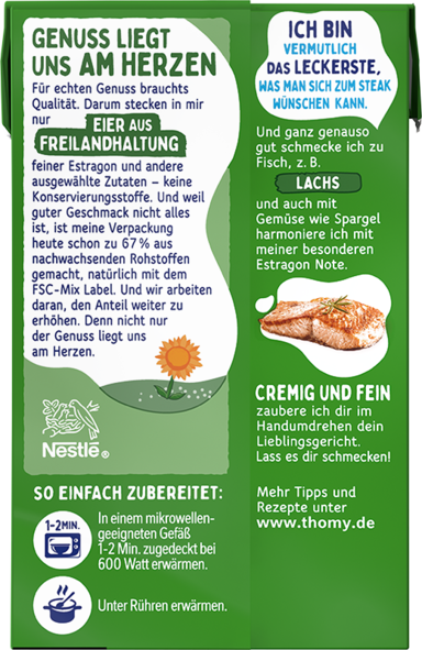 Für echten Genuss brauchts Qualität. Darum stecken in der THOMY Les Sauces Béarnaise nur Eier aus Freilandhaltung, feiner Estragon und andere ausgewählte Zutaten und keine Konservierungsstoffe.
