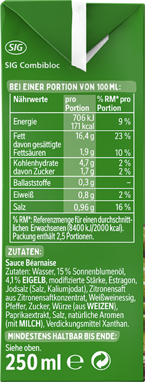 Zutaten: Wasser, 15% Sonnenblumenöl, 4,1% EIGELB, modifizierte Stärke, Estragon, Jodsalz (Salz, Kaliumjodat), Zitronensaft aus Zitronensaftkonzentrat, Weißweinessig, Pfeffer, Zucker, Würze (aus WEIZEN), Paprikaextrakt, Salz, natürliche Aromen (mit MILCH), Verdickungsmittel Xanthan.