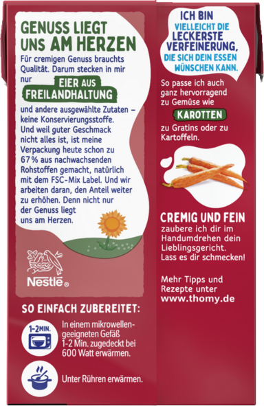 Für echten Genuss brauchts Qualität. Darum stecken in der Thomy Les Sauces Béchamel nur EIER AUS FREILANDHALTUNG und andere ausgewählte Zutaten und keine Konservierungsstoffe.