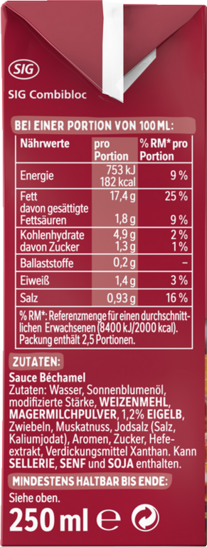 Zutaten: Wasser, Sonnenblumenöl, modifizierte Stärke, WEIZENMEHL, MAGERMILCHPULVER, 1,2% EIGELB, Zwiebeln, Muskatnuss, Jodsalz (Salz, Kaliumjodat), Aromen, Zucker, Hefeextrakt, Verdickungsmittel Xanthan. Kann SELLERIE, SENF und SOJA enthalten.