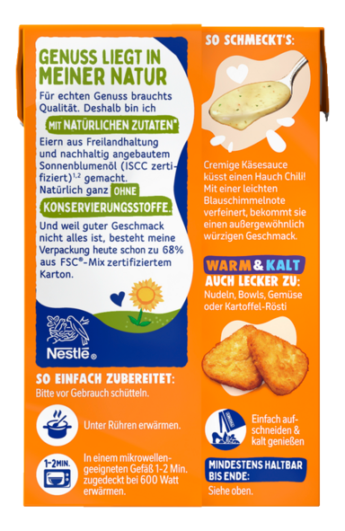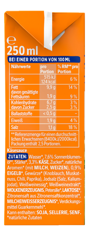 Zutaten: Wasser*, 7,6% Sonnenblumenöl* **, Stärke*, 3,3% KÄSE, Zucker*, natürliche Aromen* (mit MILCH, WEIZEN), 0,9% EIGELB*, Gewürze* (Knoblauch, Muskatnuss, Chili, Paprika), Jodsalz (Salz, Kaliumjodat), Weißweinessig*, Weißweinextrakt*, MOLKENERZEUGNIS, Petersilie*, LAKTOSE*, Zitronensaft aus Zitronensaftkonzentrat*, MILCHEIWEISSERZEUGNIS*, Verdickungsmittel Guarkernmehl*. Kann enthalten: SOJA, SELLERIE, SENF. *natürliche Zutaten **zertifizert nach ISCC Massenbilanzansatz