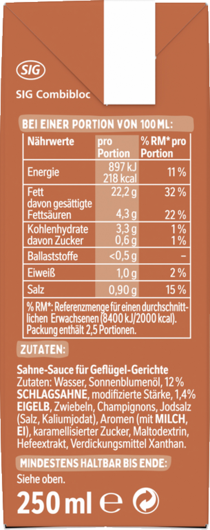 Zutaten: Wasser, Sonnenblumenöl, 12% SCHLAGSAHNE, modifizierte Stärke, 1,4% EIGELB, Zwiebeln, Champignons, Jodsalz (Salz, Kaliumjodat), Aromen (mit MILCH, EI), karamellisierter Zucker, Maltodextrin, Hefeextrakt, Verdickungsmittel Xanthan.