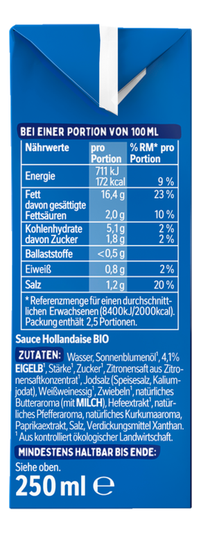 Zutaten: Wasser, Sonnenblumenöl*, 4,1% EIGELB*, Stärke*, Zucker*, Zitronensaft aus Zitronensaftkonzentrat*, Jodsalz (Speisesalz, Kaliumjodat), Weißweinessig*, Zwiebeln*, natürliches Butteraroma (mit MILCH), Hefeextrakt*, natürliches Pfefferaroma, natürliches Kurkumaaroma, Paprikaextrakt, Salz, Verdickungsmittel Xanthan.
