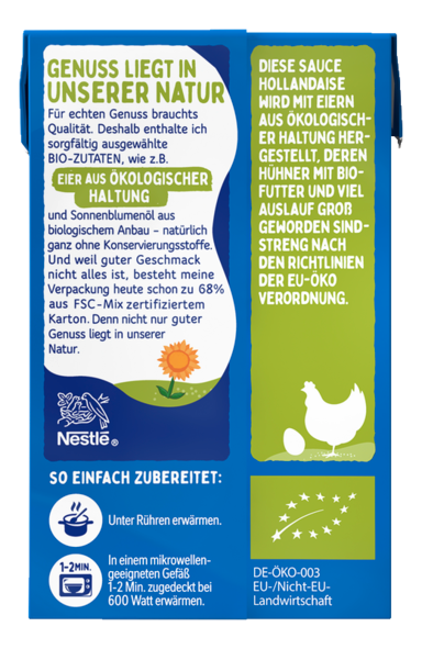 Für echten Genuss brauchts Qualität. Darum enthalte ich sorgfältig ausgewählte BIO-ZUTATEN, wie z.B. Eier aus ökologischer Haltung und Sonnenblumenöl aus biologischem Anbau – natürlich ganz ohne Konservierungsstoffe.