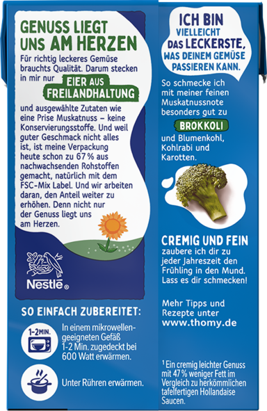 Für richtig leckeres Gemüse brauchts Qualität. Darum stecken in der THOMY Les Sauces Hollandaise für Gemüse nur Eier aus Freilandhaltung und ausgewählte Zutaten wie eine Prise Muskatnuss – keine Konservierungsstoffe.