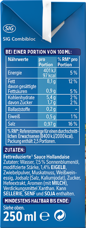 Zutaten: Wasser, 7,5% Sonnenblumenöl, modifizierte Stärke, 1,4% EIGELB, Zwiebelpulver, Muskatnuss, Weißweinessig, Jodsalz (Salz, Kaliumjodat), Zucker, Hefeextrakt, Aromen (mit MILCH), Verdickungsmittel Xanthan. Kann SELLERIE, SENF und SOJA enthalten.