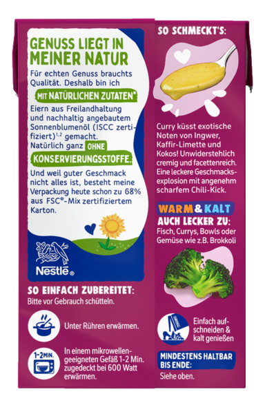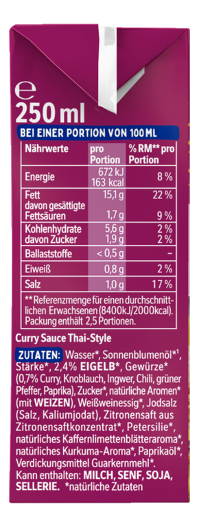 Zutaten: Wasser*, Sonnenblumenöl* **, Stärke*, 2,4% EIGELB*, Gewürze* (0,7% Curry, Knoblauch, Ingwer, Chili, grüner Pfeffer, Paprika), Zucker*, natürliche Aromen* (mit WEIZEN), Weißweinessig*, Jodsalz (Salz, Kaliumjodat), Zitronensaft aus Zitronensaftkonzentrat*, Petersilie*, natürliches Kaffernlimettenblätteraroma*, natürliches Kurkuma-Aroma*, Paprikaöl*, Verdickungsmittel Guarkernmehl*. Kann enthalten: MILCH, SENF, SOJA, SELLERIE. *natürliche Zutaten **zertifiziert nach ISCC Massenbilanzansatz