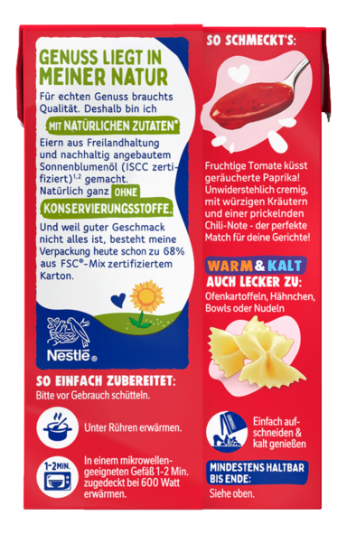 Zutaten: 54% Tomatenmark*, Wasser*, 5,1% Paprikapüree*, Sonnenblumenöl* **, Zucker*, Gewürze* (Knoblauch, Zwiebeln, geräuchertes Paprikapulver (Paprika, Rauch), Kardamom, Chili, Pfeffer, Paprika), Zitronensaft aus Zitronensaftkonzentrat*, EIGELB*, natürliches Aroma* (mit WEIZEN), Jodsalz (Salz, Kaliumjodat), Weißweinessig*, Kräuter* (Petersilie, Basilikum), Sojasaucenpulver (SOJABOHNEN, Salz, WEIZEN), Paprikaöl*, Verdickungsmittel Guarkernmehl*. Kann enthalten: MILCH, SELLERIE, SENF. *natürliche Zutaten **zertifizert nach ISCC Massenbilanzansatz