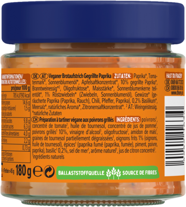 Zutaten: Paprika*, Tomatenmark*, Sonnenblumenöl*, Apfelsaftkonzentrat*, 10% gegrillte Paprika*, Branntweinessig*, Oligofruktose*, Maisstärke*, Sonnenblumenkerne teilentölt*, 1% Röstzwiebeln* (Zwiebeln, Sonnenblumenöl), Gewürze* (geräucherte Paprika (Paprika, Rauch), Chili, Pfeffer, Paprika), 0,2% Basilikum*, Meersalz*, natürliches Aroma*, Zitronensaftkonzentrat*, *natürliche Zutaten