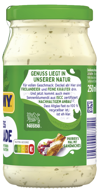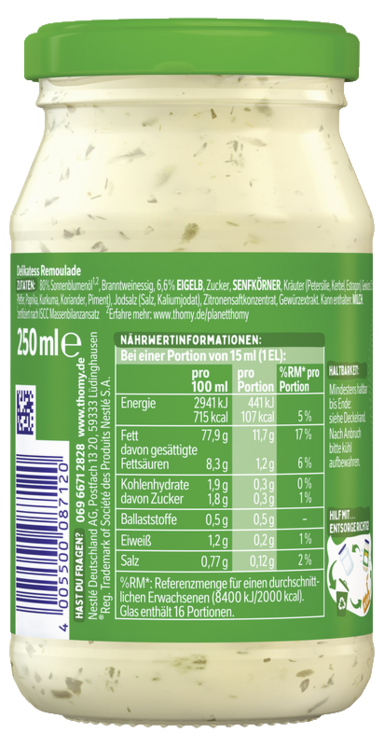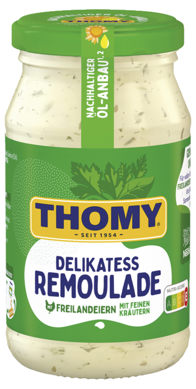 Die THOMY Delikatess-Remoulade ist mit natürlichen Zutaten, Freilandeiern und feinen Kräutern gemacht. Dass Altglas fast zu 100 % recycelbar ist, ist eh klar.