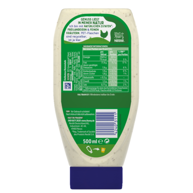 Ich bin mit natürlichen Zutaten*, Freilandeiern und feinen Kräutern. PET-Flaschen sind recycelbar, ist ja klar.