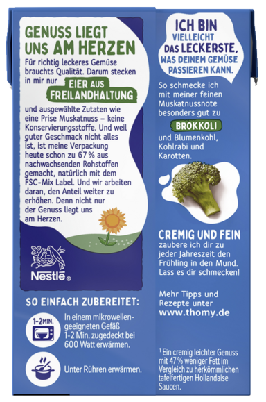 Für richtig leckeres Gemüse brauchts Qualität. Darum stecken in der THOMY Les Sauces Hollandaise für Gemüse nur Eier aus Freilandhaltung und ausgewählte Zutaten wie eine Prise Muskatnuss – keine Konservierungsstoffe.