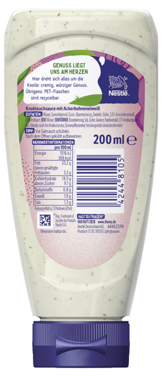 Zutaten: Wasser, Sonnenblumenöl, Zucker, Branntweinessig, Zwiebeln, Stärke, 2,0 % Ackerbohneneiweiß, 2,0 % Knoblauch, SENF (Wasser, SENFKÖRNER, Branntweinessig, Salz, Zucker, Gewürze, Paprikaextrakt), 1,7 % Knoblauchpulver, Salz, Petersilie, natürliches Knoblaucharoma, Zitronensaftkonzentrat, Verdickungsmittel Johannisbrotkernmehl.